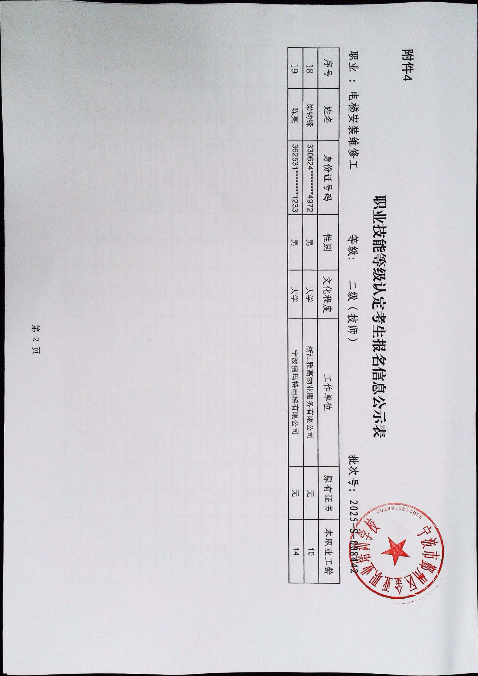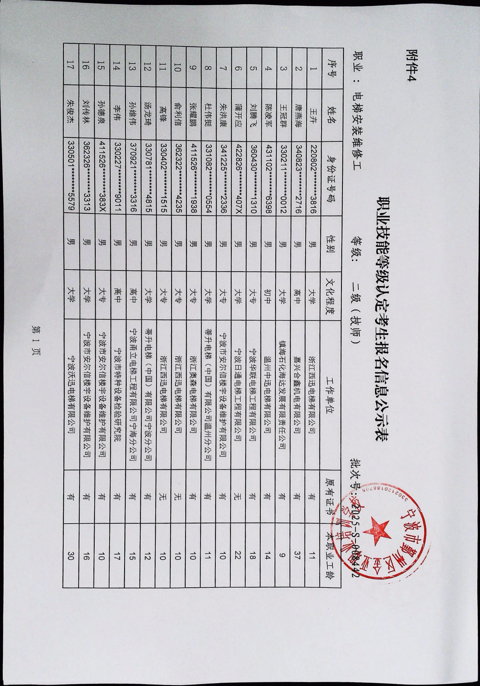 按照宁波市人社局鉴定中心公开电梯安装维修工等级认证考试公告规定的程序,把鄞州区人社局鉴定中心审核通过名单进行公示,现公示名单附件: