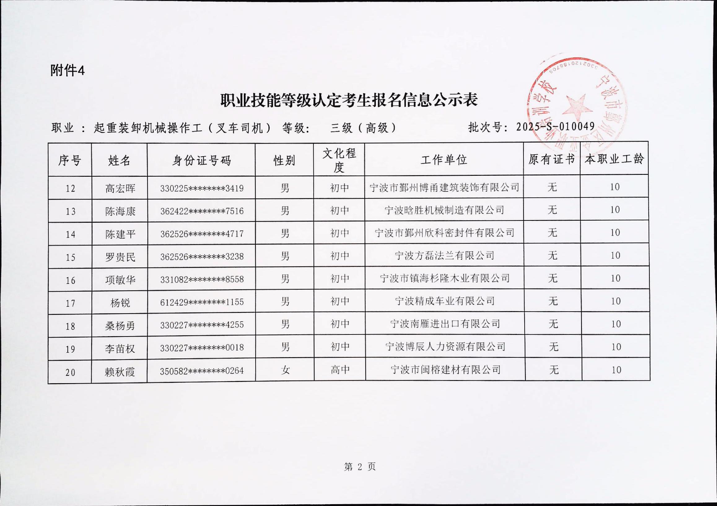 按照宁波市人社局鉴定中心公开叉车司机等级认证考试公告规定的程序,把鄞州区人社局鉴定中心审核通过名单进行公示,现公示名单附件: