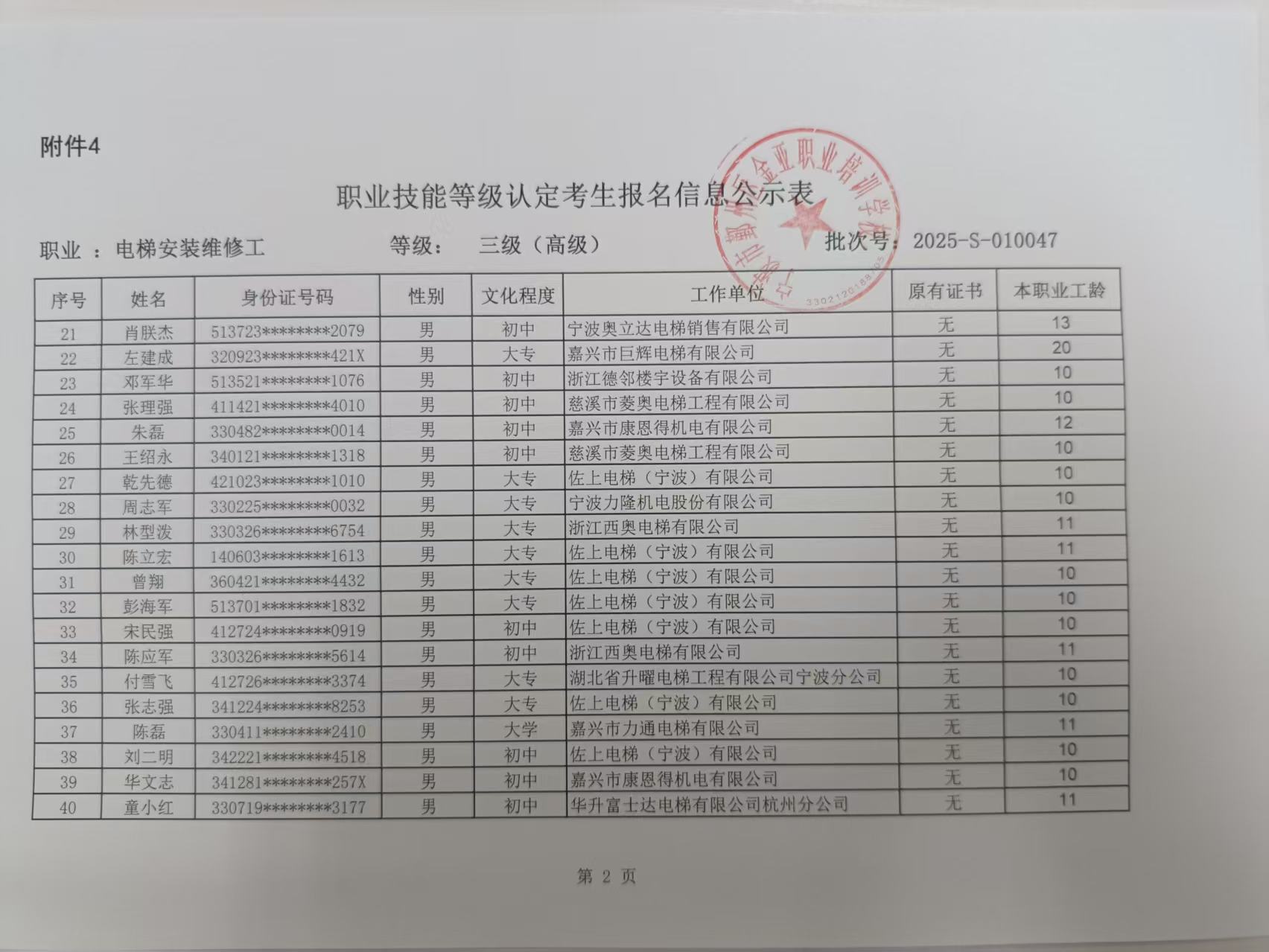 按照宁波市人社局鉴定中心公开电梯安装维修工等级认证考试公告规定的程序,把鄞州区人社局鉴定中心审核通过名单进行公示,现公示名单附件: