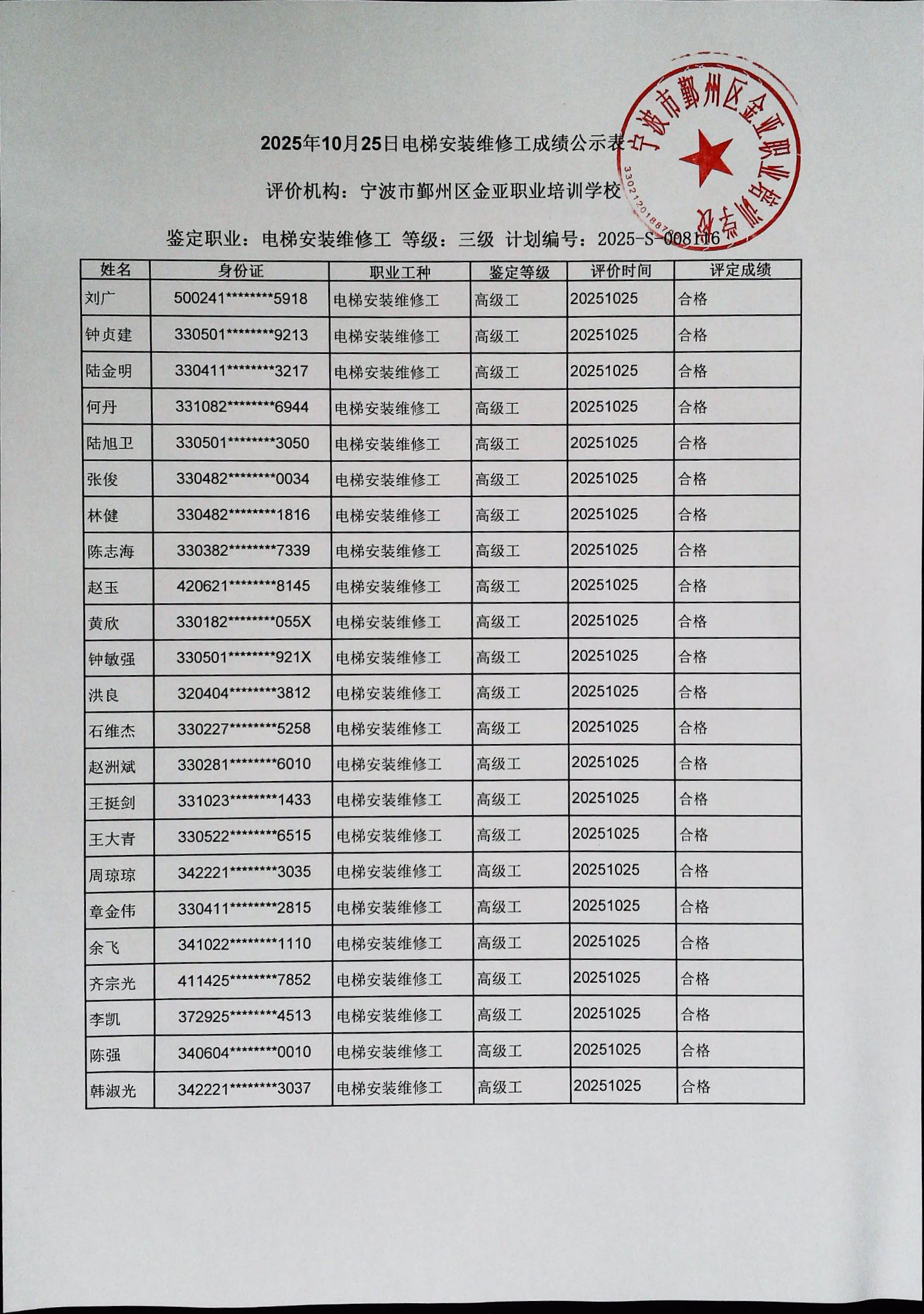 2025年10月25日电梯安装维修工高级成绩公示