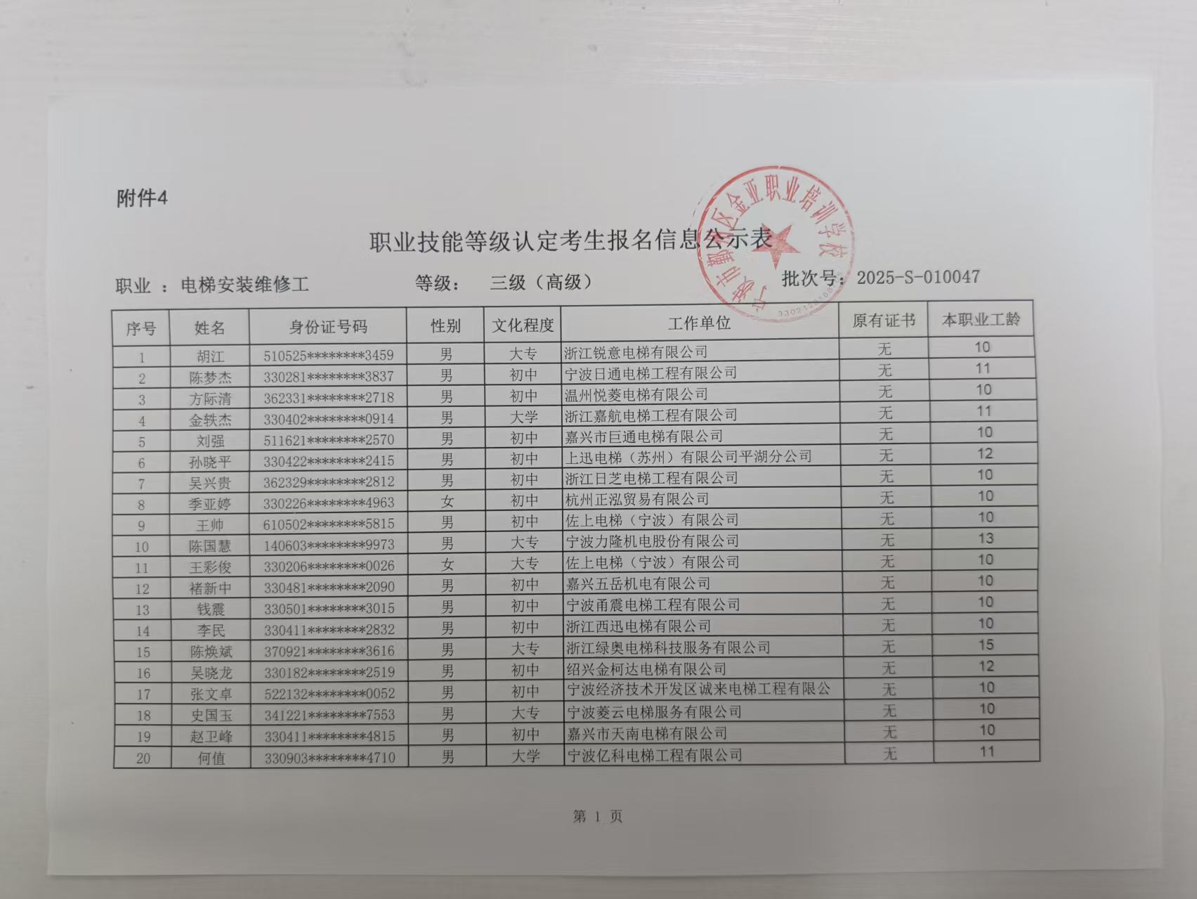 按照宁波市人社局鉴定中心公开电梯安装维修工等级认证考试公告规定的程序,把鄞州区人社局鉴定中心审核通过名单进行公示,现公示名单附件: