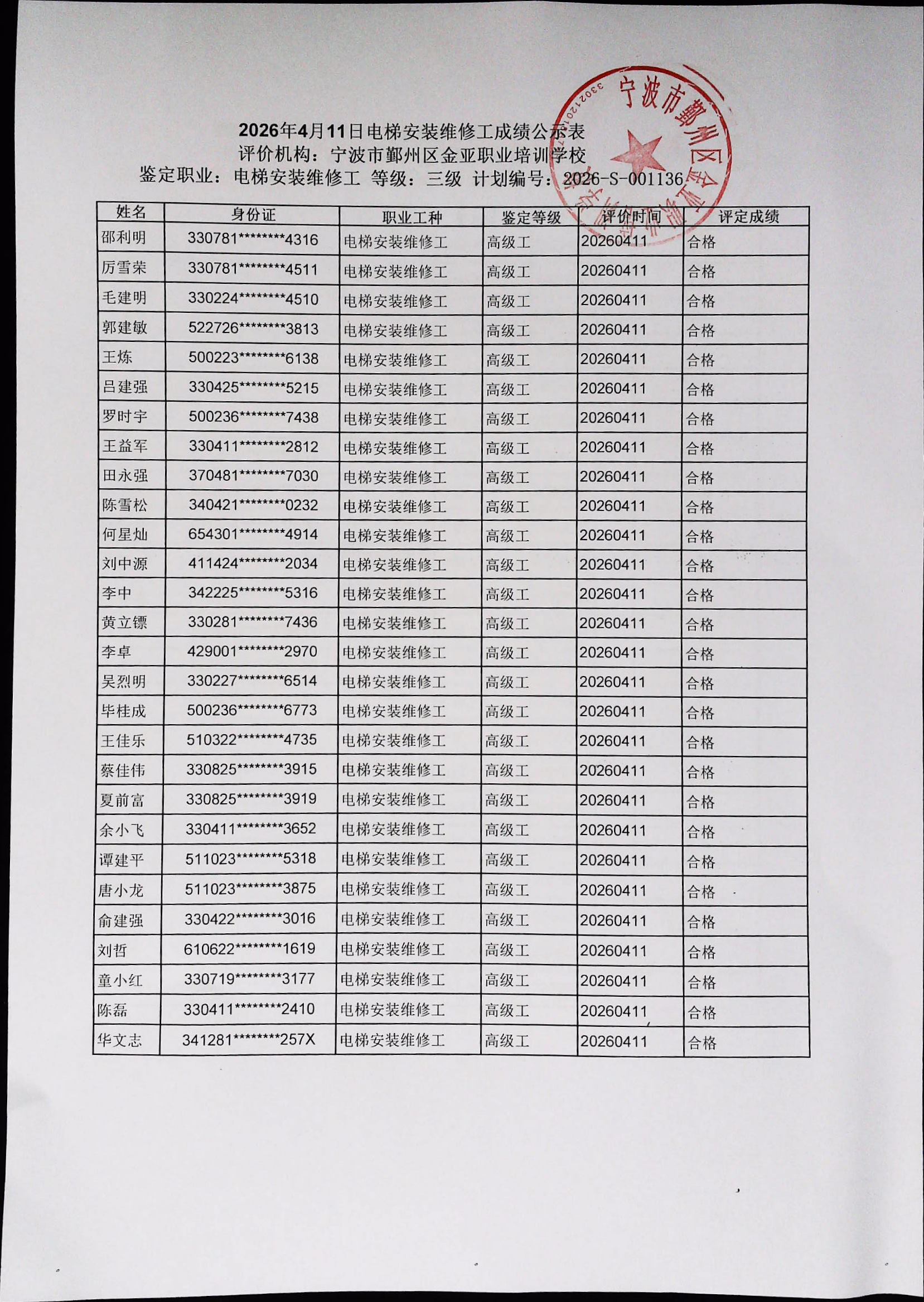 2026年4月11日电梯安装维修工高级成绩公示